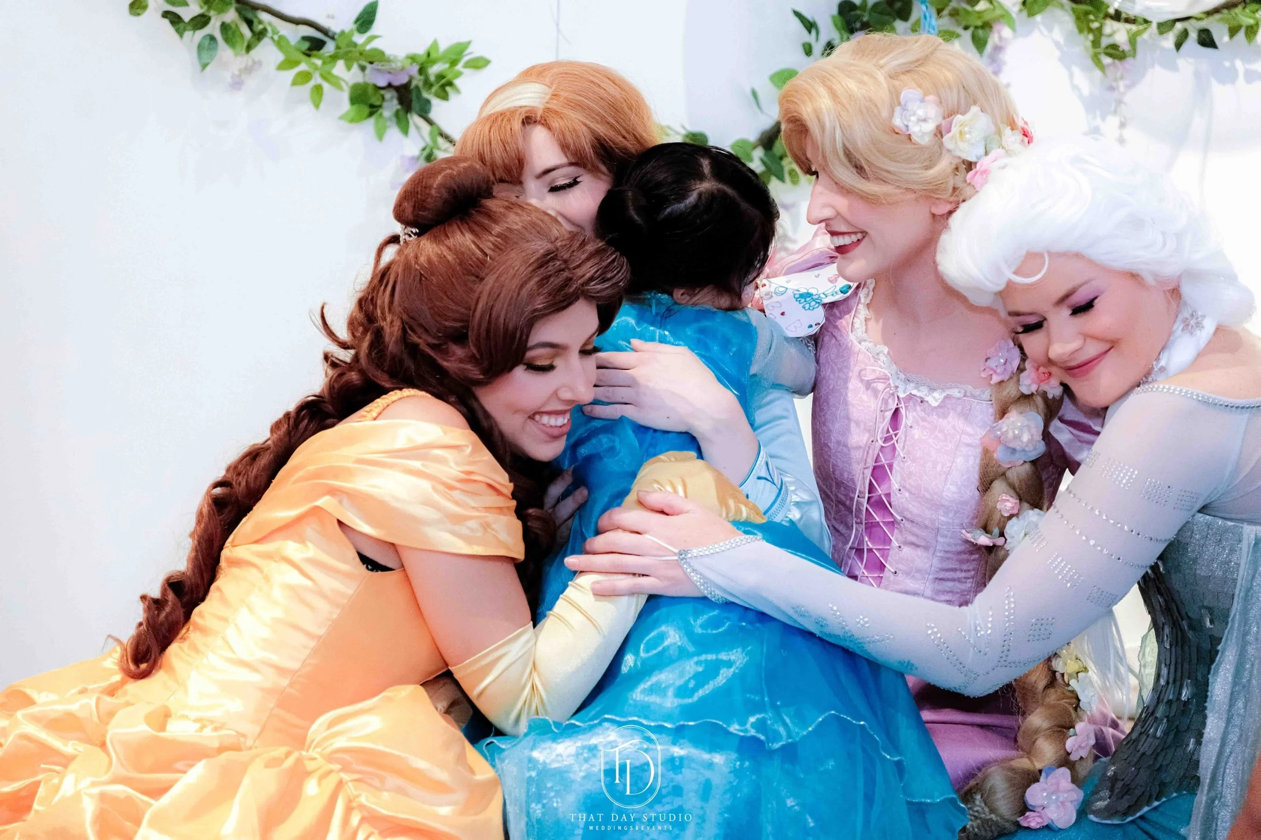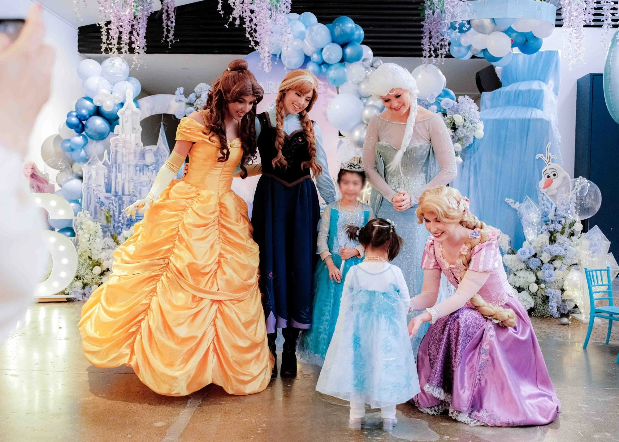 Children celebrating with two women dressed as princesses, holding hands and playing together, surrounded by pastel-colored balloons.